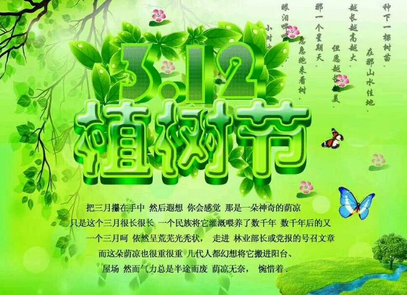 阳春三月,春风拂面,清新的空气沁人心脾,又到一年植树播绿的好时节,第38个植树节悄悄到来。每年的3月12日就是我们中国的植树节,这一天倡导大家多多植树造林,造福后代。早在孙中山时期,就已经开始有了植树节,那时候的植树节是每年的清明节。中国的植树节经历过几次变迁,最终才定为现在的每年的3月12日。每年的植树节,也就是正春暖花开的时节,这时候万物复苏,最适合植树了。所以每年植树节最重要的活动就是义务植树了,各行各业的人们都会加入到义务植树的大军。植树造林是利国利民的举动,所以植树节这天,我们一定尽所能的多多植树,让我们的生活环境更加美丽。一起提高大家“植绿、护绿、爱绿、兴绿”的意识。